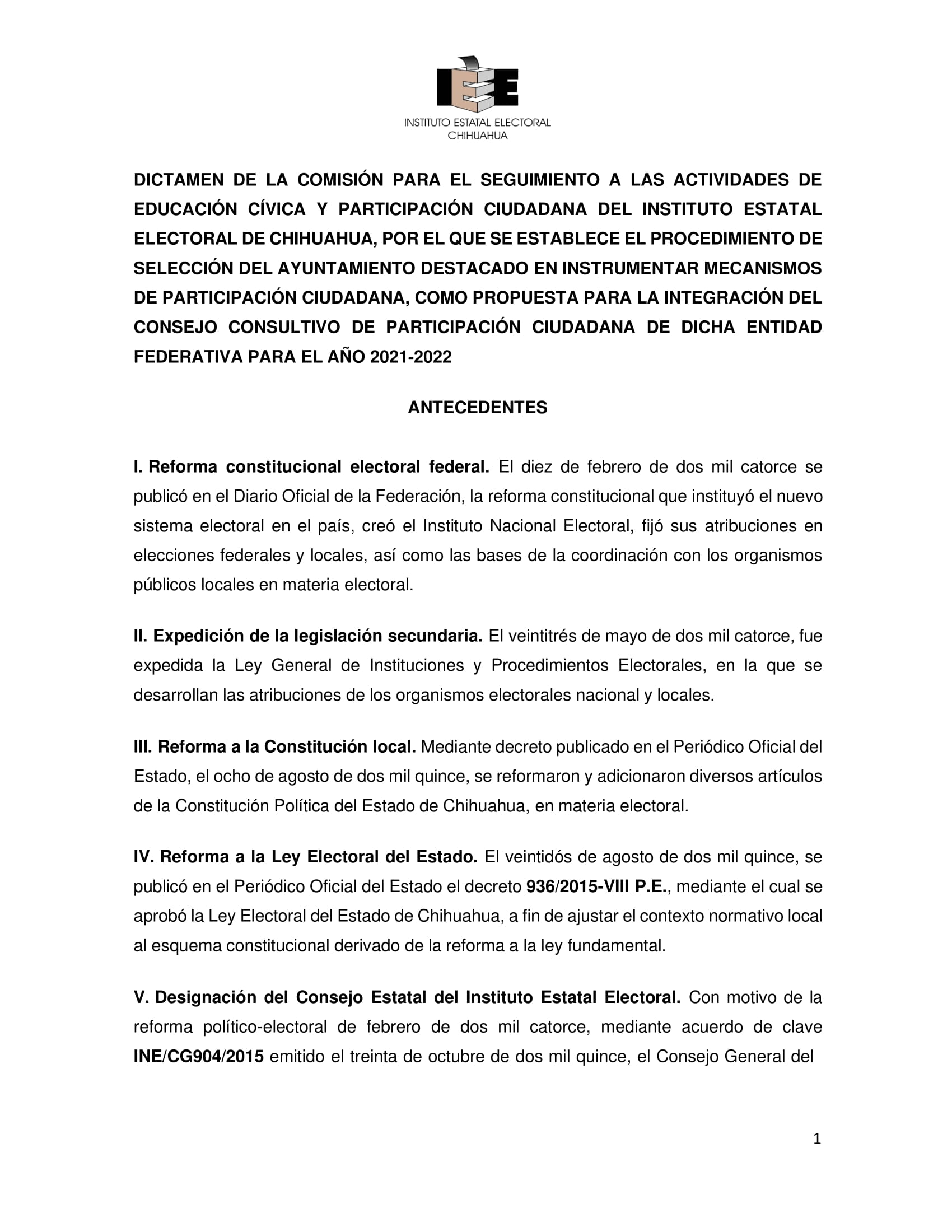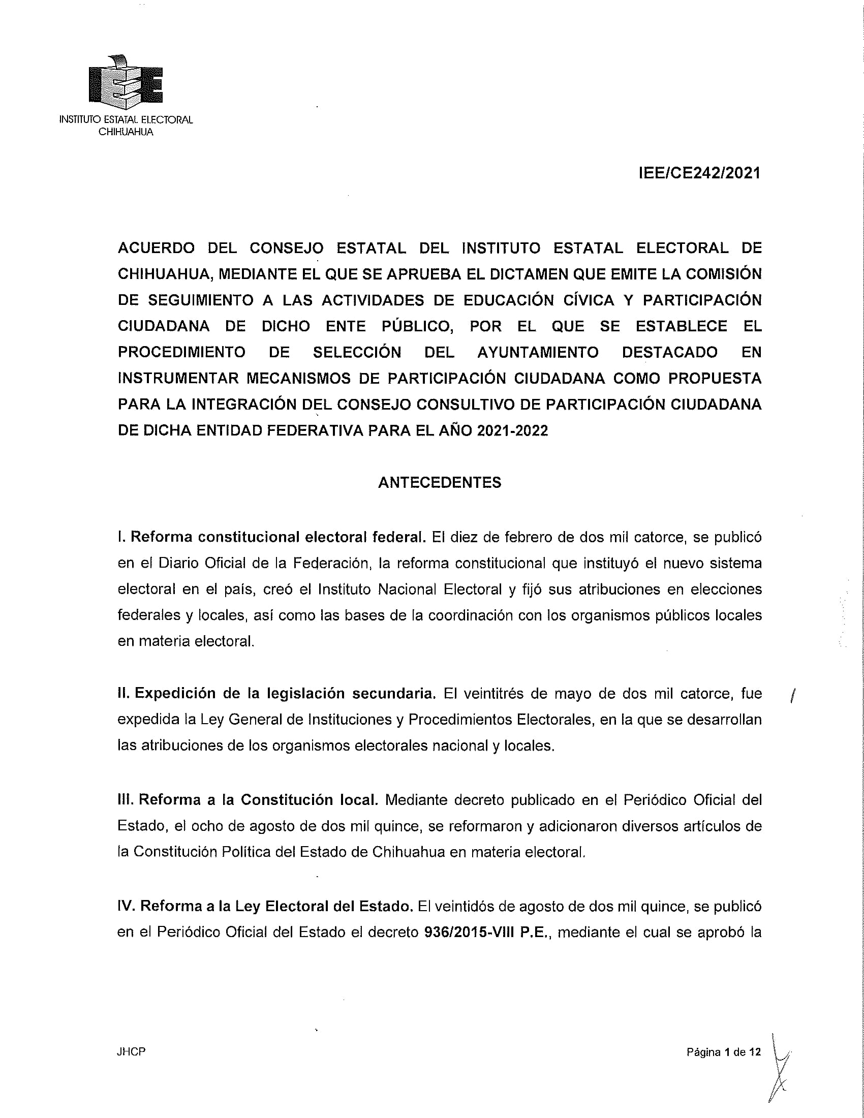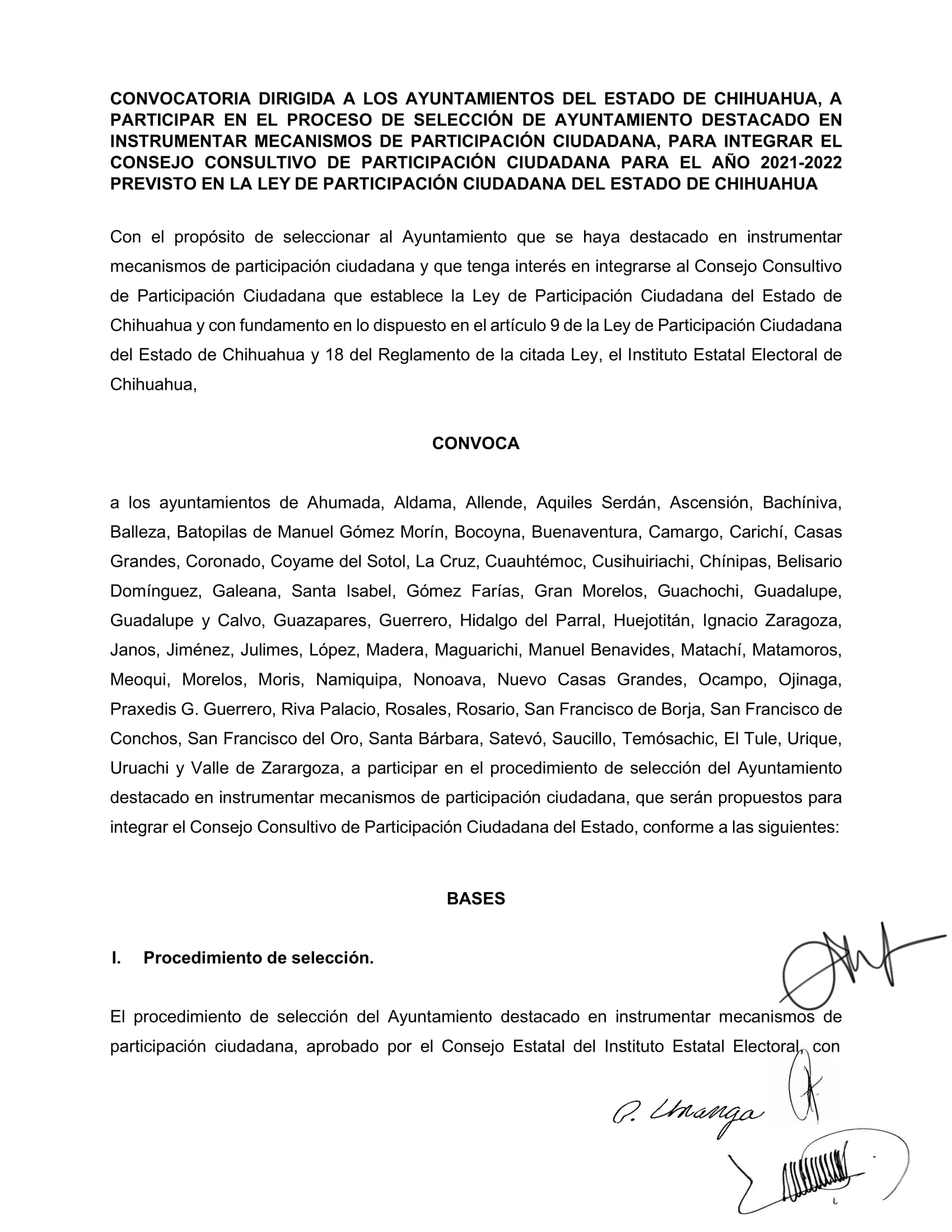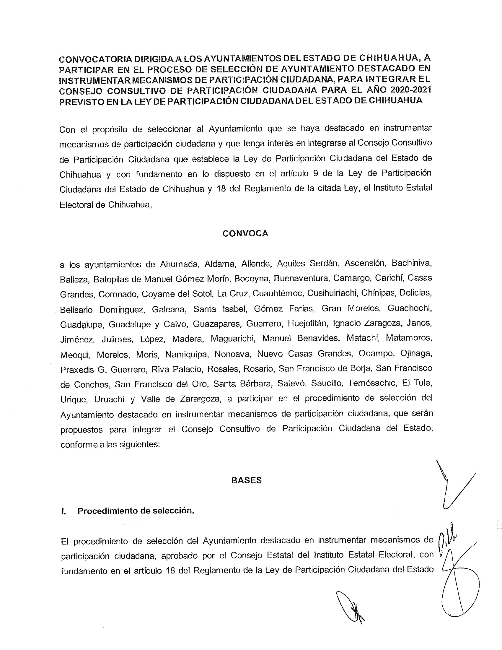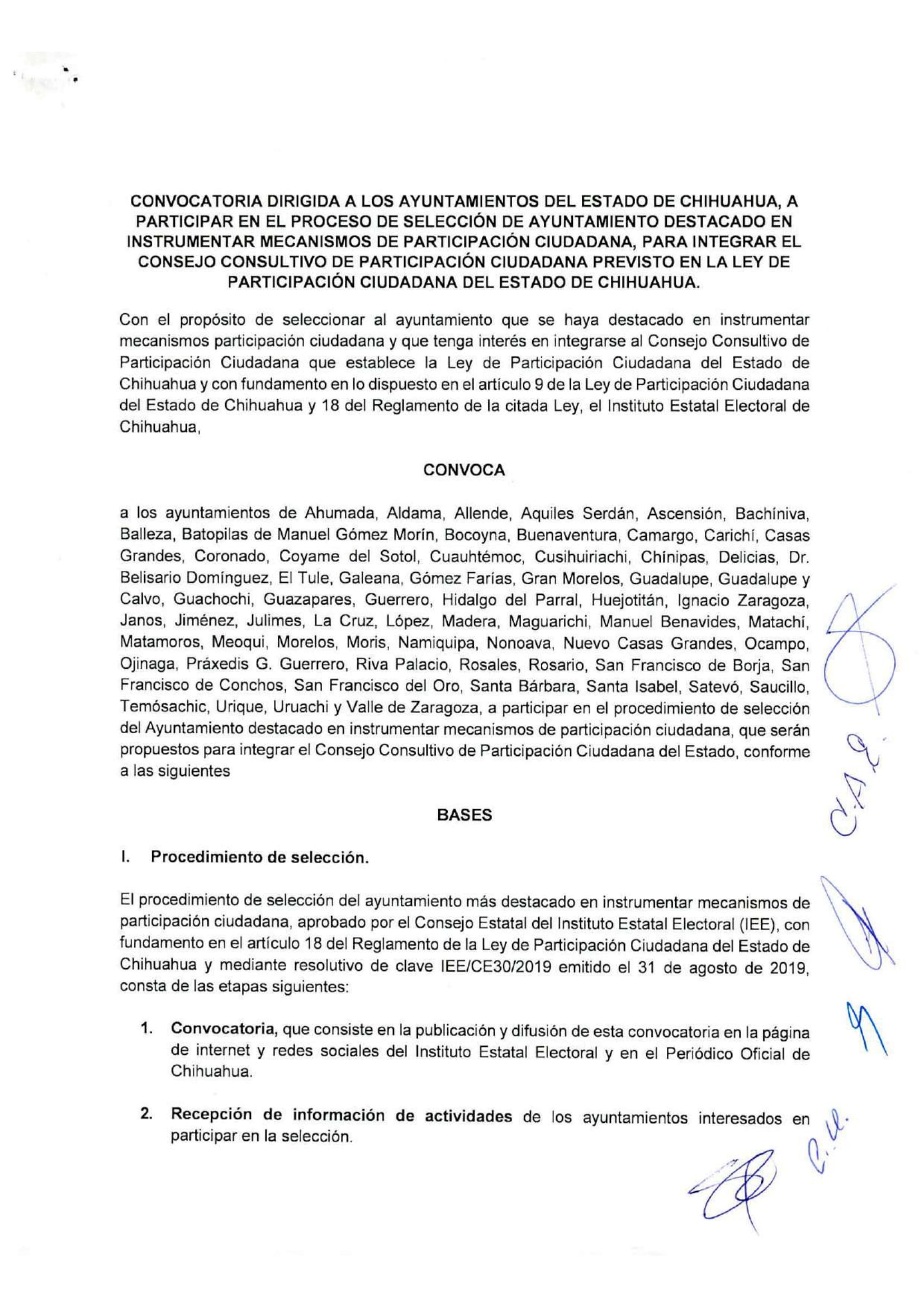 El Instituto Estatal Electoral de Chihuahua (IEE) invita a los Ayuntamientos que deseen participar en la Convocatoria de Ayuntamiento Destacado 2024, con el propósito de seleccionar al Ayuntamiento que se haya destacado en instrumentar mecanismos de participación ciudadana y que tenga interés en integrarse al Consejo Consultivo de Participación Ciudadana que establece la Ley de Participación Ciudadana del Estado de Chihuahua con fundamento en lo dispuesto en el artículo 9 de la Ley de Participación Ciudadana del Estado de Chihuahua y 18 del Reglamento de la citada Ley. El Ayuntamiento Destacado será elegido de entre los ayuntamientos que participen en el procedimiento de selección, conforme a la convocatoria que para tal efecto emite el IEE y que se reproduce arriba en este sitio, bajo los siguientes elementos de evaluación: