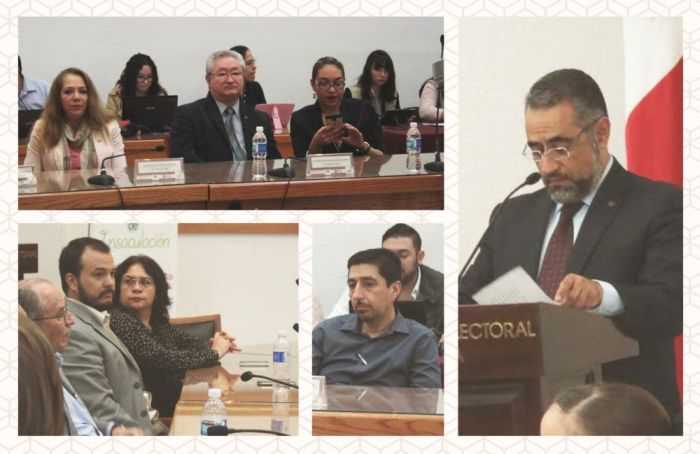 El Consejero Presidente del Instituto Estatal Electoral Arturo Meraz González, el Subsecretario de Planeación y Evaluación de la Secretaría de Educación, Cultura y Deporte Osvaldo Martínez Rempening, los Consejeros Electorales Saúl Eduardo Rodríguez Camacho, Gilberto Sánchez Esparza, Claudia Arlett Espino, Alonso Bassanetti Villalobos, María Elena Cárdenas Méndez, Julieta Fuentes Chávez; el niño Raúl Alexandro Ortega Rodríguez, alumno de la Primaria Federal “Ricardo Flores Magón”; niña Fabiola Delgado Terrazas, alumna de la Primaria Estatal “Carmen Romano No. 2042”; niño Brandon Aarón Tarango, alumno de CONAFE de la Primaria Comunitaria “Estación Ojo Laguna”; niño Carlos Arturo González González, alumno de la Primaria “Cuitlahuac” y la niña Alejandra Guadalupe Miranda Rentería, alumna del CAM Estatal No. 7016.