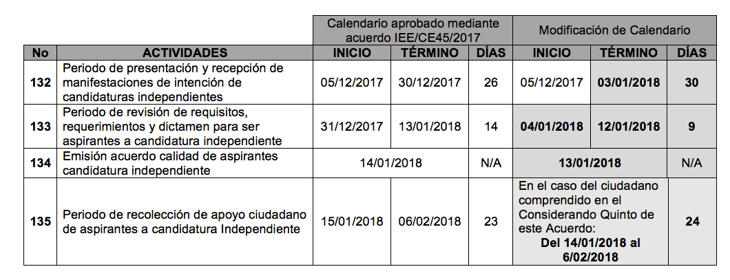 La tabla siguiente ilustra los cambios al calendario electoral de este organismo electoral local, aprobado por este Consejo Estatal, mediante acuerdo de clave IEE/CE45/2017: