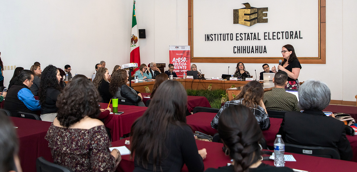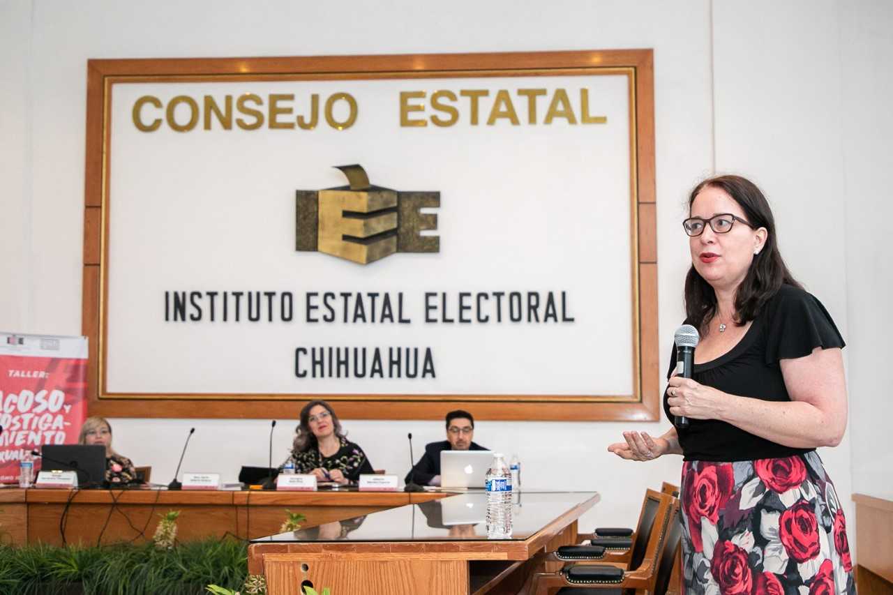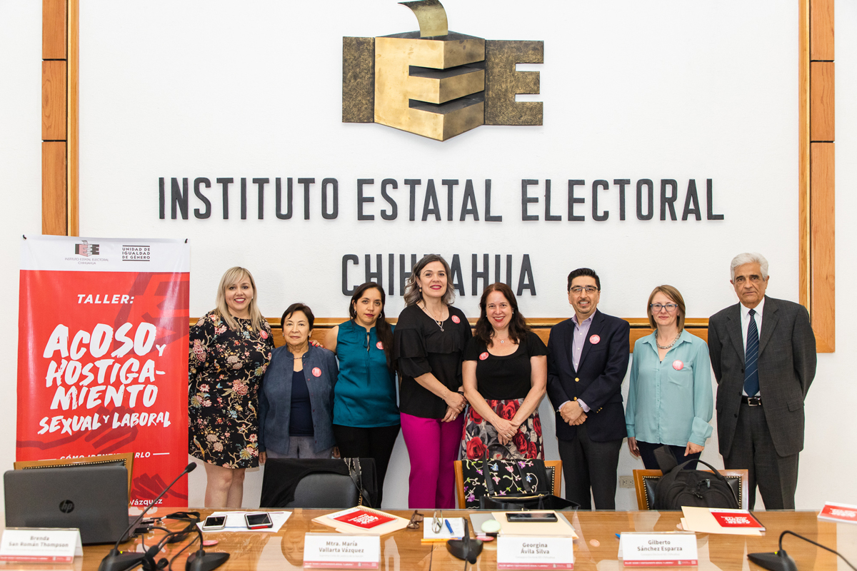 Chihuahua, Chih. - La reflexión de cómo prevenir, identificar y combatir el acoso y el hostigamiento sexual y laboral en los centros de trabajo quedó en las mentes de las personas que asistieron al taller, impartido por la maestra María Vallarta Vázquez en la sala de sesiones del Instituto Estatal Electoral de Chihuahua (IEE).