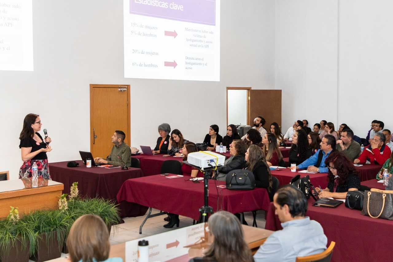 De las estadísticas presentadas en la capacitación, el 15 por ciento de mujeres y el 5 por ciento de hombres manifestaron haber sido víctimas de acoso sexual en la Administración Pública Federal y el 20 por ciento de mujeres y 6 por ciento de hombres denunciaron el hostigamiento y el acoso.