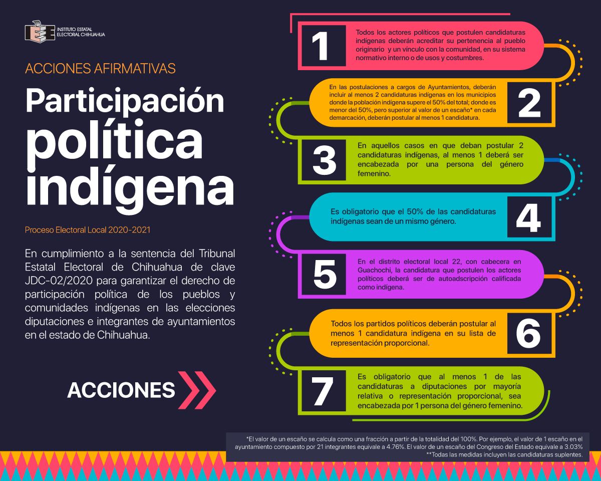 El Consejo Estatal del Instituto Estatal Electoral (IEE), en respeto a la diversidad étnica y cultural de nuestro estado y en cumplimiento de la sentencia del Tribunal Estatal Electoral de Chihuahua (TEE), emitió medidas específicas para todos los actores políticos – partidos, coaliciones o candidaturas comunes- en materia de postulación de Diputaciones e integrantes de Ayuntamientos.