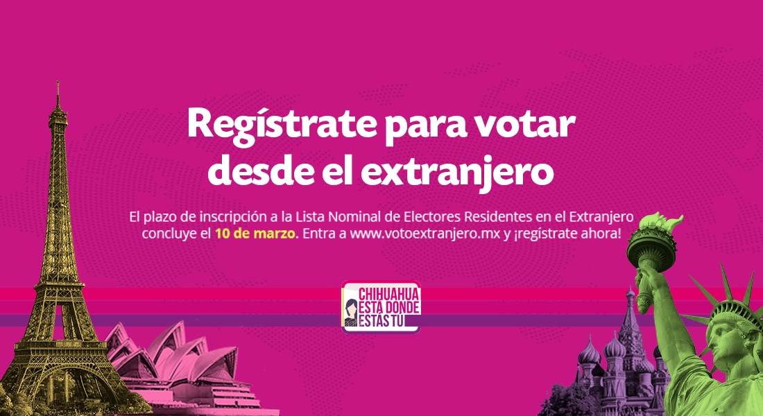 Chihuahua, Chih. — El próximo 10 de marzo vence el plazo para registrarse ante el Sistema de Registro para Votar desde el Extranjero, por lo que el Instituto Estatal Electoral de Chihuahua (IEE) hace el llamado a las y los chihuahuenses que residen fuera del país y que cuentan con una credencial para votar vigente, a que realicen este trámite y así puedan ejercer su derecho a votar en el Proceso Electoral Local 2020-2021.