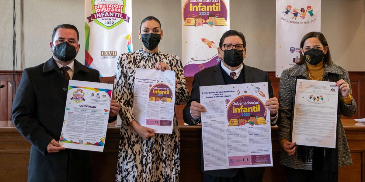Chihuahua, Chih. — El Instituto Estatal Electoral (IEE), el Tribunal Superior de Justicia del Estado, el Congreso del Estado y la Secretaría de Educación y Deporte de Gobierno del Estado de Chihuahua, presentaron en rueda de prensa, las convocatorias Gobernadora(or) Infantil 2022, Diputado y Diputada Infantil por un día edición 2022 y Magistratura Infantil 2022.