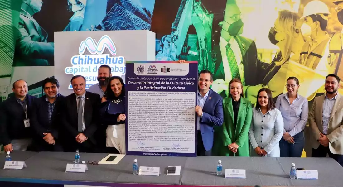Chihuahua, Chih.— El Instituto Estatal Electoral de Chihuahua (IEE) y Municipio de Chihuahua firmaron un convenio para promover y fortalecer la Cultura Cívica y la Participación Ciudadana en la población infantil, adolescente y juvenil en la capital chihuahuense.